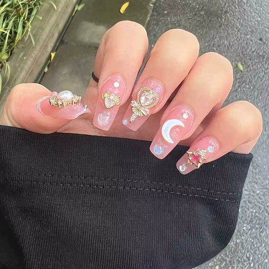 Regal Pink Coffin Nails – Handmade Luxury with Moon & Star Gems